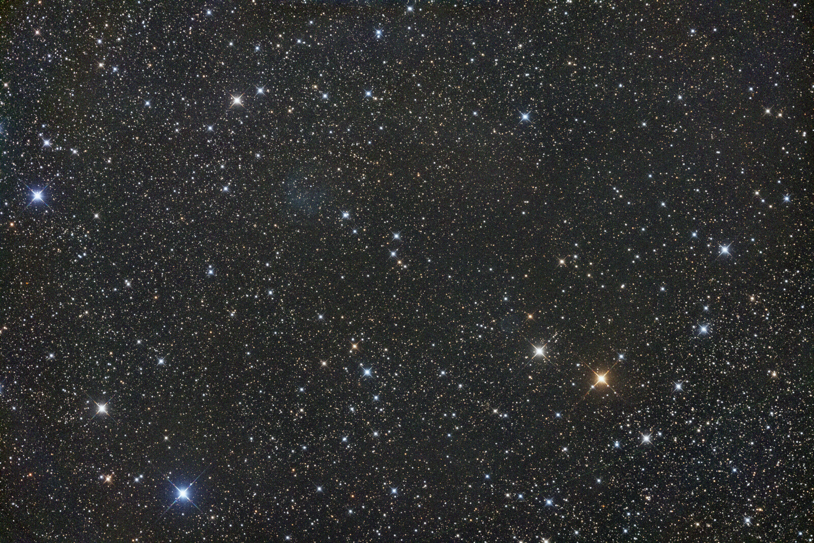 中央やや斜め左上の青い淡いシミのようなものがHFG1です。対して中央やや右下の淡い小さなシミがAbell6です。