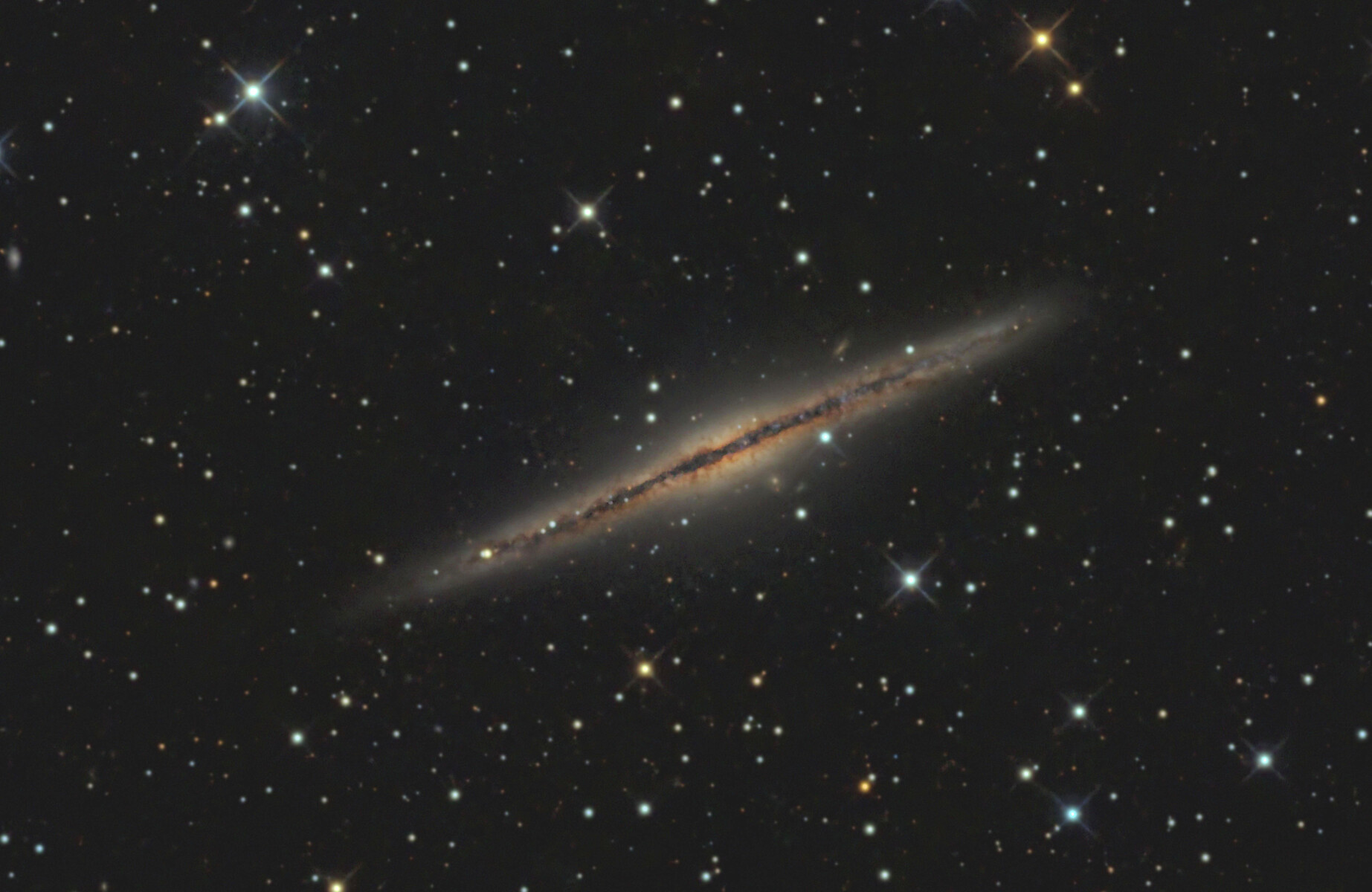 銀河系を真横からみたような系外銀河はNGC4565が有名ですが、このNGC891も小ぶりながら中心部の暗黒帯の微細構造がとても興味深く気に入っている銀河の一つです。