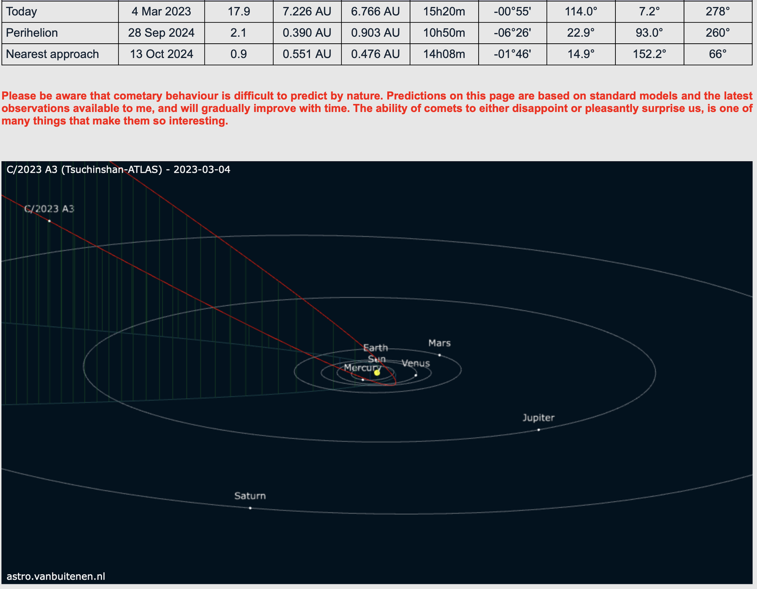 3/4本日の位置はこちら。まだ土星と木星軌道の間にいて、17.8等とのこと。核が大きく近日点(2024年9月28日)距離が0.4AU弱であることから、崩壊しなければかなり明るくなると考えられます。