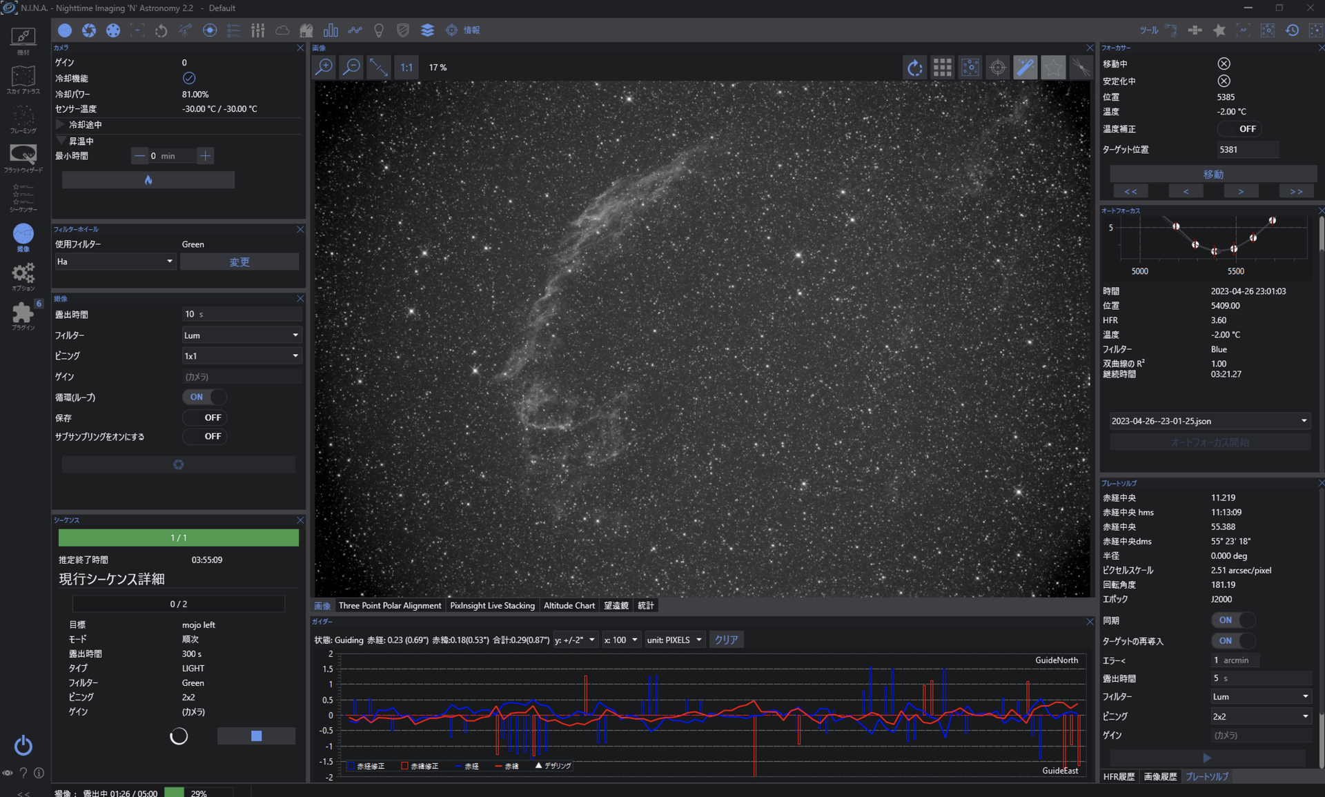 はい、やはりRGGBフィルターで、光量が1/3になってしまうのが、結構痛い気がします。ある程度明るい被写体はよく写るし、輝線星雲なら、DualBandフィルターの登場もあって、カラーカメラでもいいな、と思うのですが・・。