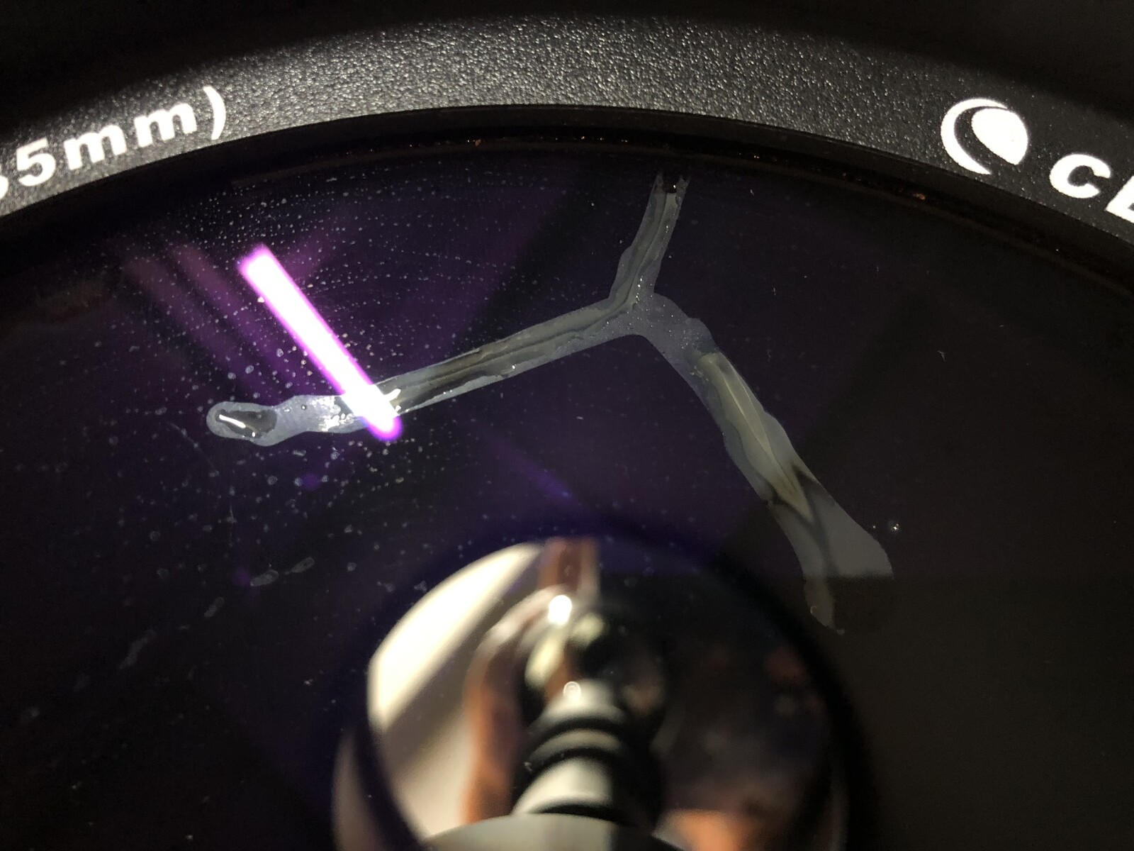 最初なぜ液体が付いているのか分からず、補正板の外側にあるものと思って濡れたティッシュで拭いたら、全然取れず。 ??と思ってよく見てみると