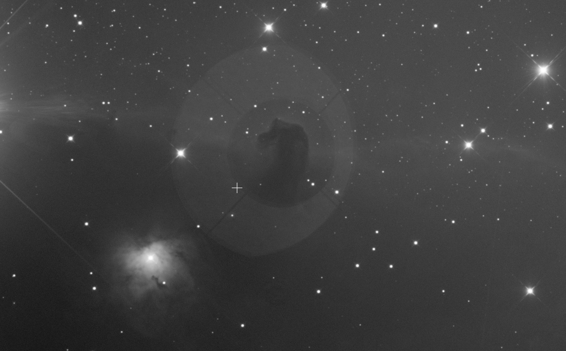 私も馬頭を25cmRC(FL2000mm)と同じフラットナーで狙ったのですが、画面外にある悪魔のようなアルニタクの光が流れ込んで、とても本撮影を開始できませんでした。