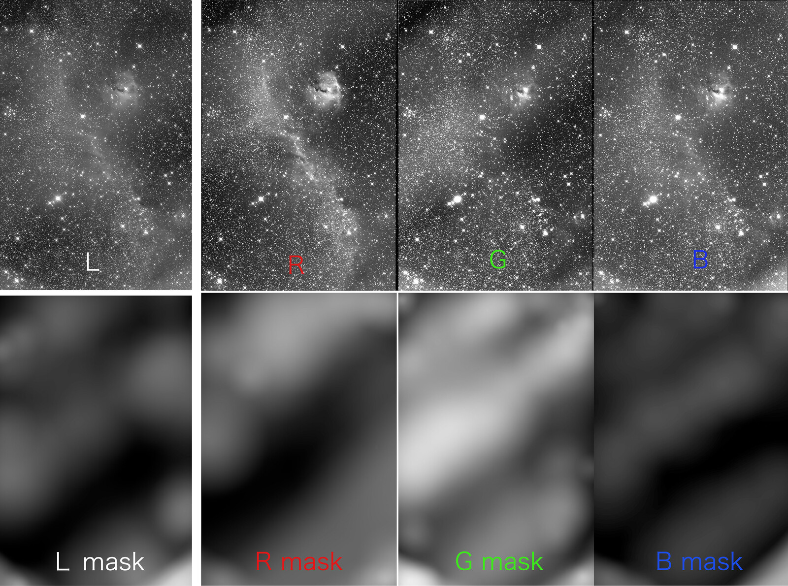 LRGB別々の被り補正は良いような良くないようなです。もしかしたら本来あるべき濃淡まで殺しているかもしれません。被りなのか本来の濃淡なのか分からないんです。分子雲なんてもってのほか。暗い空で撮らないと駄目です。