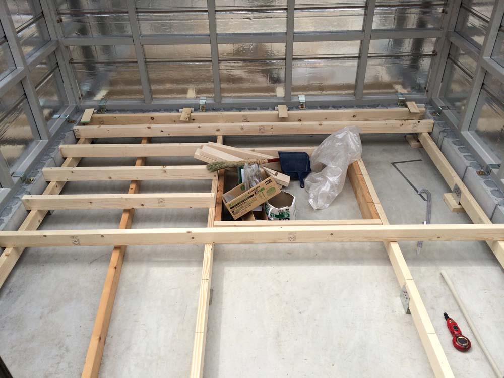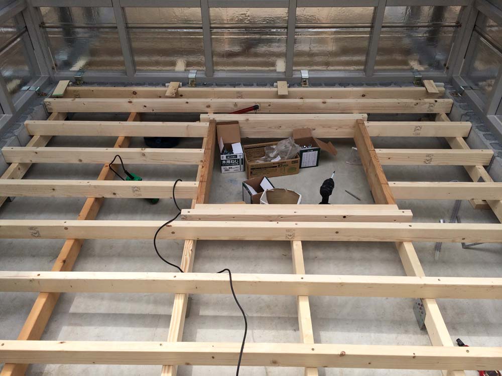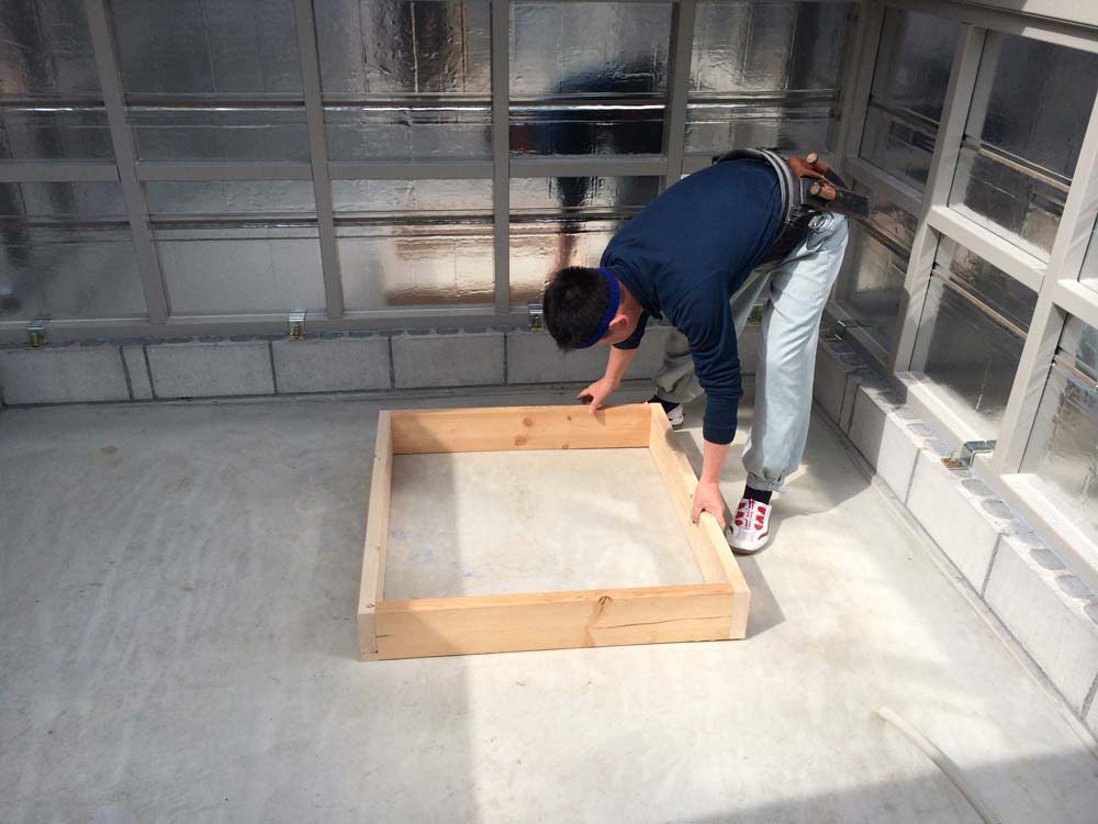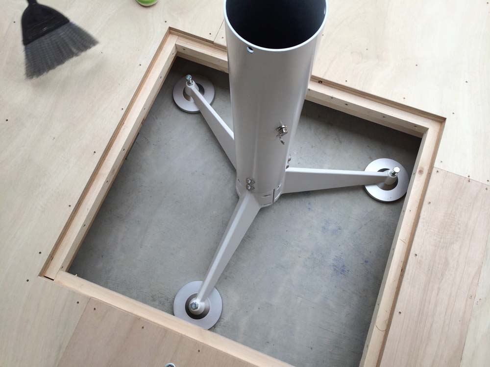 カットされたアンカーボルト。ピラー脚部分に簡単にアクセスできるように枠を作ります。床の支える土台の柱を組み上げていきます。組み上がりました。床となる15mm厚の合板を張っていきます。張れました。次はピラー部分を作ります。ピラーをセットしてみました。半分入れてみました。望遠鏡もセットしてみました。延長筒をつけて丁度良い高さです。ニュートンなら必要ないでしょう。