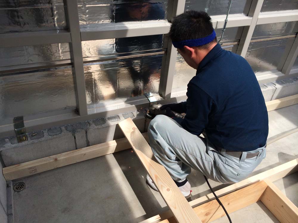 床張り工事のために前日の夜、観測所内にて望遠鏡を組み上げて望遠鏡の設置位置決定と極軸合わせを行いました。折角セットしたので接近中の火星をみました(^_^)vスライドルーフを固定しているアンカーボルトです。出っ張っているので床を張るのに邪魔ですし、危ないなあと思っていました。そこで、友人の大工さんと相談し、思い切って出っ張った部分をカットして貰い、床の下に隠れる様にお願いしました。
