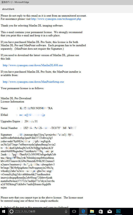 ほかのソフトはインストール・動作とも問題なさそうでしたが、 MaxIm DL6.0をインストールし、登録しようと、ライセンスの書かれたメールをコピーして MaxIm DL6.0を立ち上げても自動でペーストされません。空欄のままです。