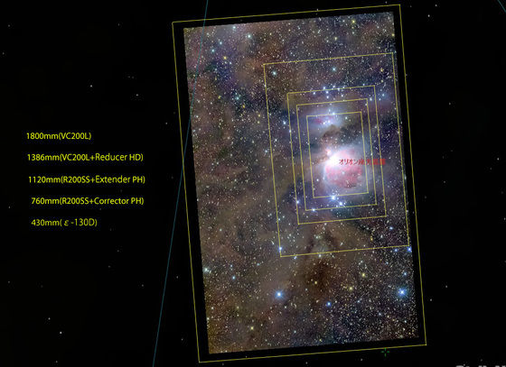 購入を迷ったのはその焦点距離。800mmF4→1120mmF5.6となりますが、手持ちのVC200L(1800mmF9)にレデューサーHDをつけると1386mmF6.9となり、その差は262mm。1段明るくはなりますが、焦点距離が1120mmと1386mmではあまり変わらないなあと。(最外周がε130D、外から2番目がR200SS+コレクターPH、3番目がR200SS+エクステンダーPH、4番目がVC200L+レデューサーHD、最内周がVC200L直焦点)