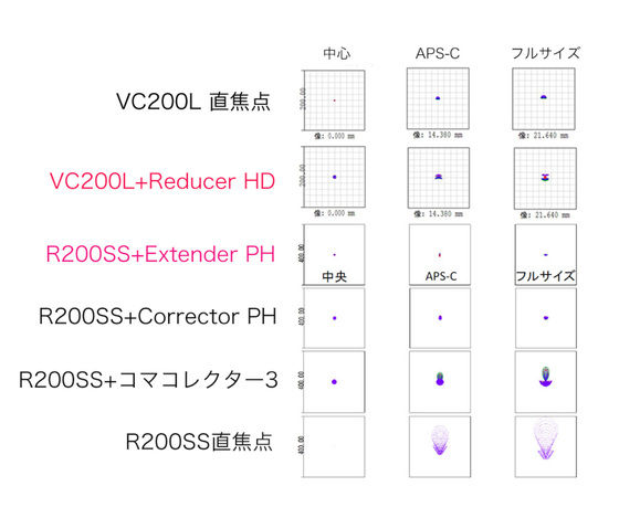 フルサイズ最周辺まで星像が良好なのは両者同じですが、周辺光量が、VC200L+レデューサーHDは47%なのに対してR200SS+エクステンダーPHは70%と豊富なのが魅力です。