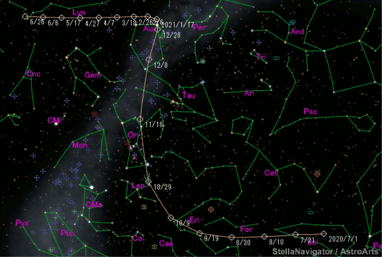 11月にオリオン座を足早に縦断して行きます。最大光度は8等切るかどうかですが、明るくなってくれると良いですね。